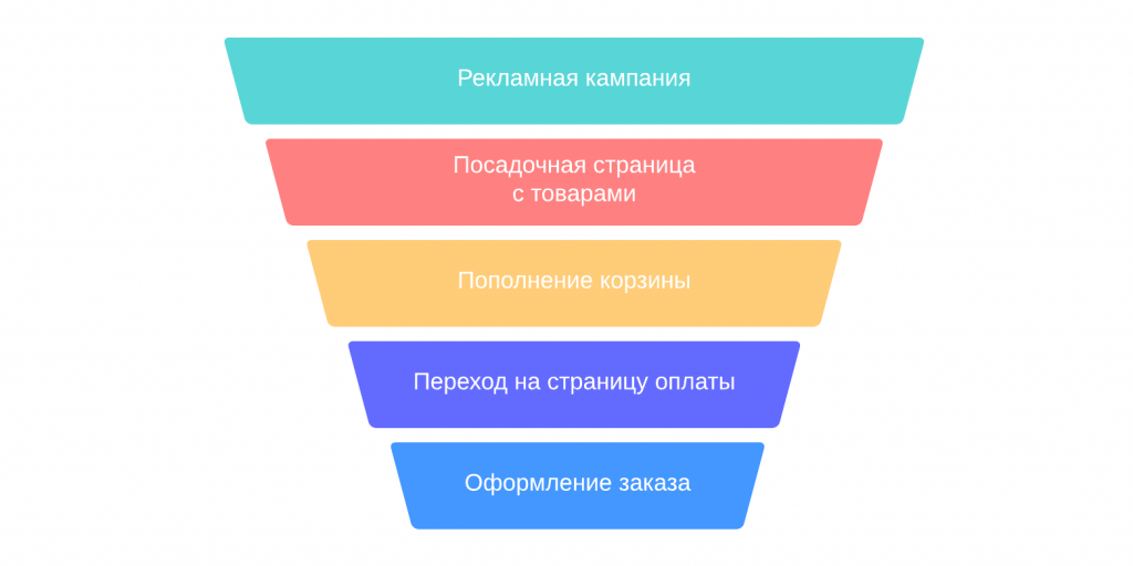 Почему это называется в бизнесе воронкой продаж? Вы наверняка примерно представляете, как она выглядит – условно ее можно описать как перевернутый вершиной вниз треугольник. Внизу располагается самая широкая часть, олицетворяя первое взаимодействия. Действительно, увидеть рекламу могут сотни человек. Но не все они будут взаимодействовать с брендом дальше. Тех, кто проявит интерес, то есть, кликнет по рекламному объявлению, будет меньше, положивших товар в корзину – еще меньше. И уж совсем немногие из тех сотен, которые видели баннеры, реально что-то купят. То есть, с каждым шагом людей все меньше и меньше, а до конца доходят единицы.