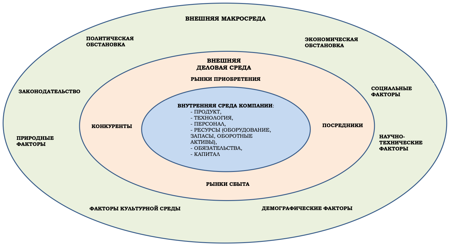 Представьте внешнюю и внутреннюю среду, влияющие на компанию, таким образом:
