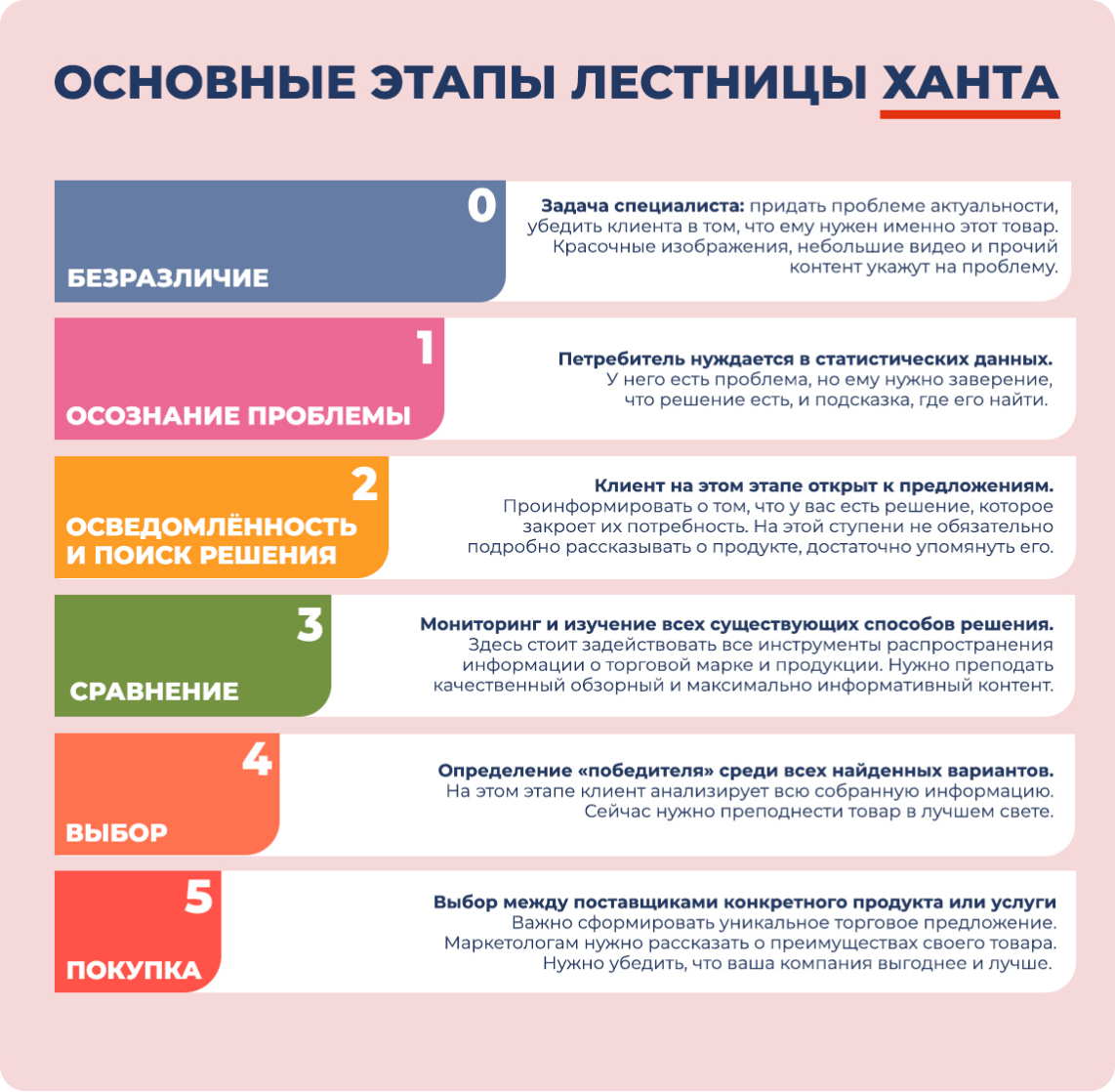 Лестница осведомлённости Ханта — маркетинговый инструмент, который с большей точностью определять целевые запросы клиентов. Лестница состоит из пяти ступеней, и на каждой из них у клиента возникает уникальная проблема. Задача маркетолога — предложить решение определённой проблемы в нужный момент. Зная, на какой ступени находится потенциальный клиент, легче подобрать технику выявления потребностей.