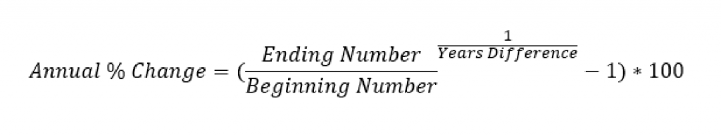 Чтобы закончить, вычтите единицу из этой степени и умножьте на 100, чтобы получить годовое процентное изменение между двумя цифрами за этот период времени. Вот формула целиком:
