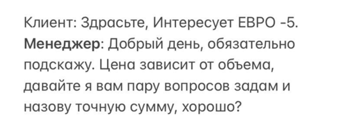 Далее менеджер задает вопросы: уточняет, в связи с чем возникла потребность, какой транспорт у клиента, где он раньше закупал дизельное топливо и на каких условиях. После этого проводится презентация и закрытие на целевое действие.