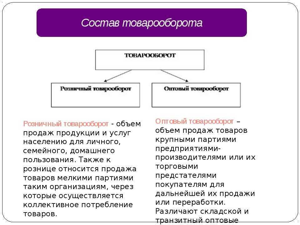 Товарооборот — это обращение товаров, процесс продвижения их от производителя к потребителю. Различают товарооборот: