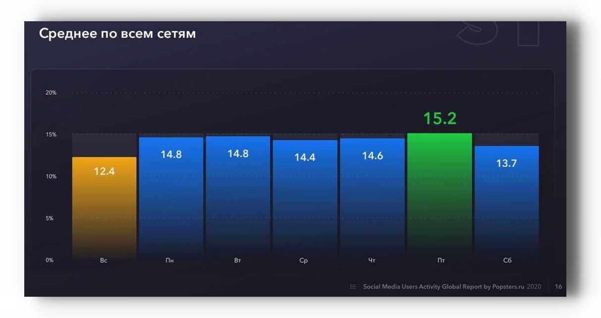 Есть неплохие шансы, что контент опубликованный в пик активности аудитории, привлечет внимание большего числа пользователей.. Учтите, что соцсети находятся в постоянном движении и на волне очередного хайпа данные легко могут измениться