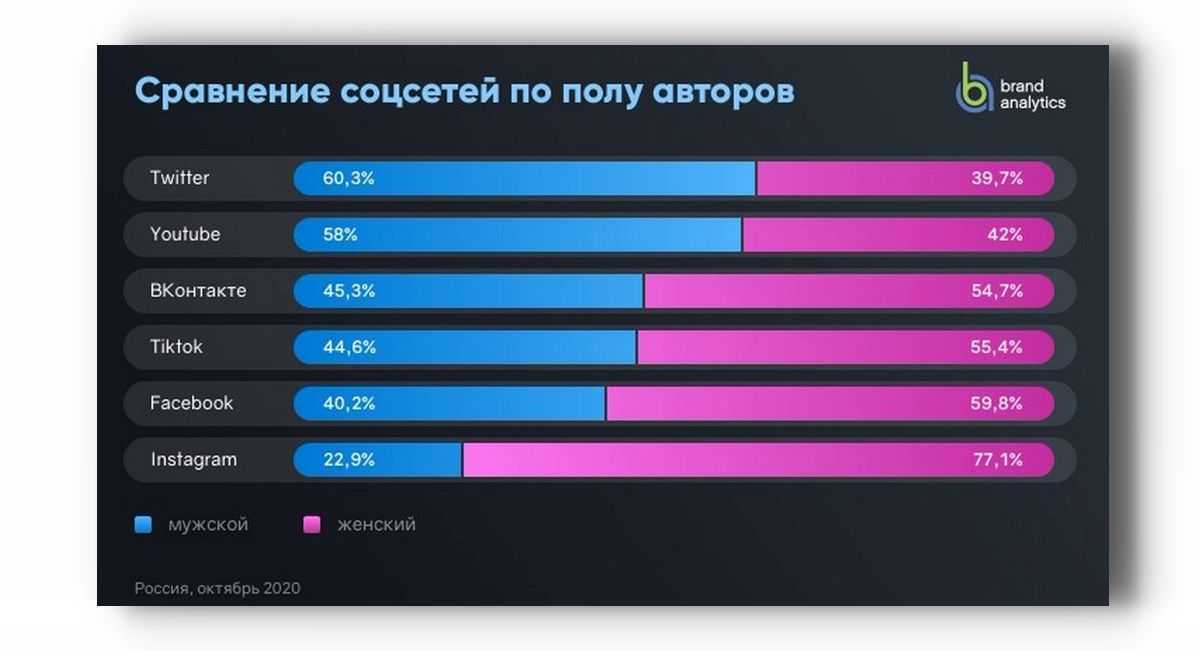 В исследовании Brand Analytics показан процент мужской и женской аудитории в разных соцсетях, возраст пользователей.