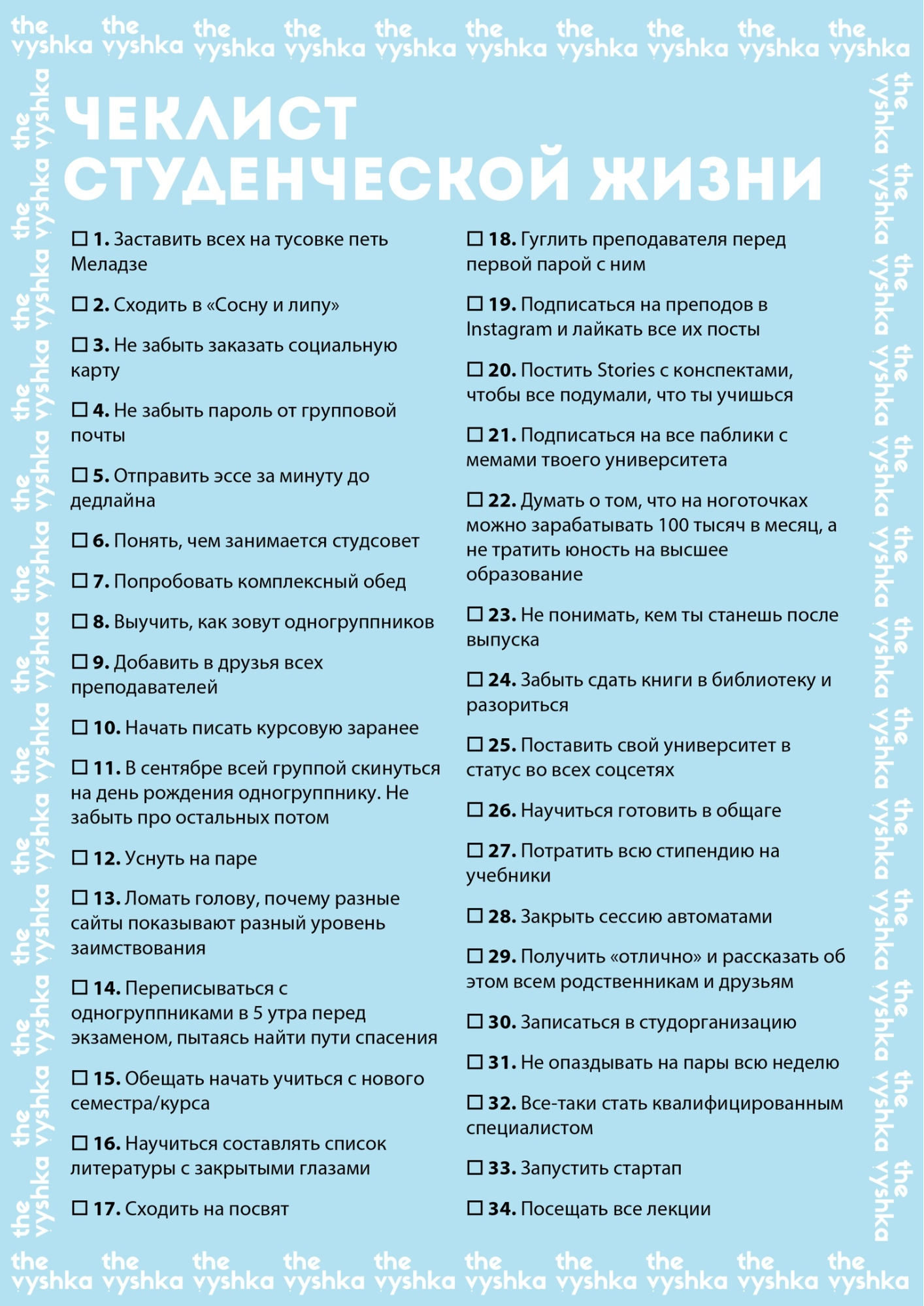 Отдельно стоит выделить развлекательные чек-листы. Они несут не практическую или информационную ценность, а скорее удовольствие от чтения и проставления галочек (часто мысленного). К ним можно отнести списки различных идей: от «осенних дел» и новых сериалов до шутливого чек-листа студента.