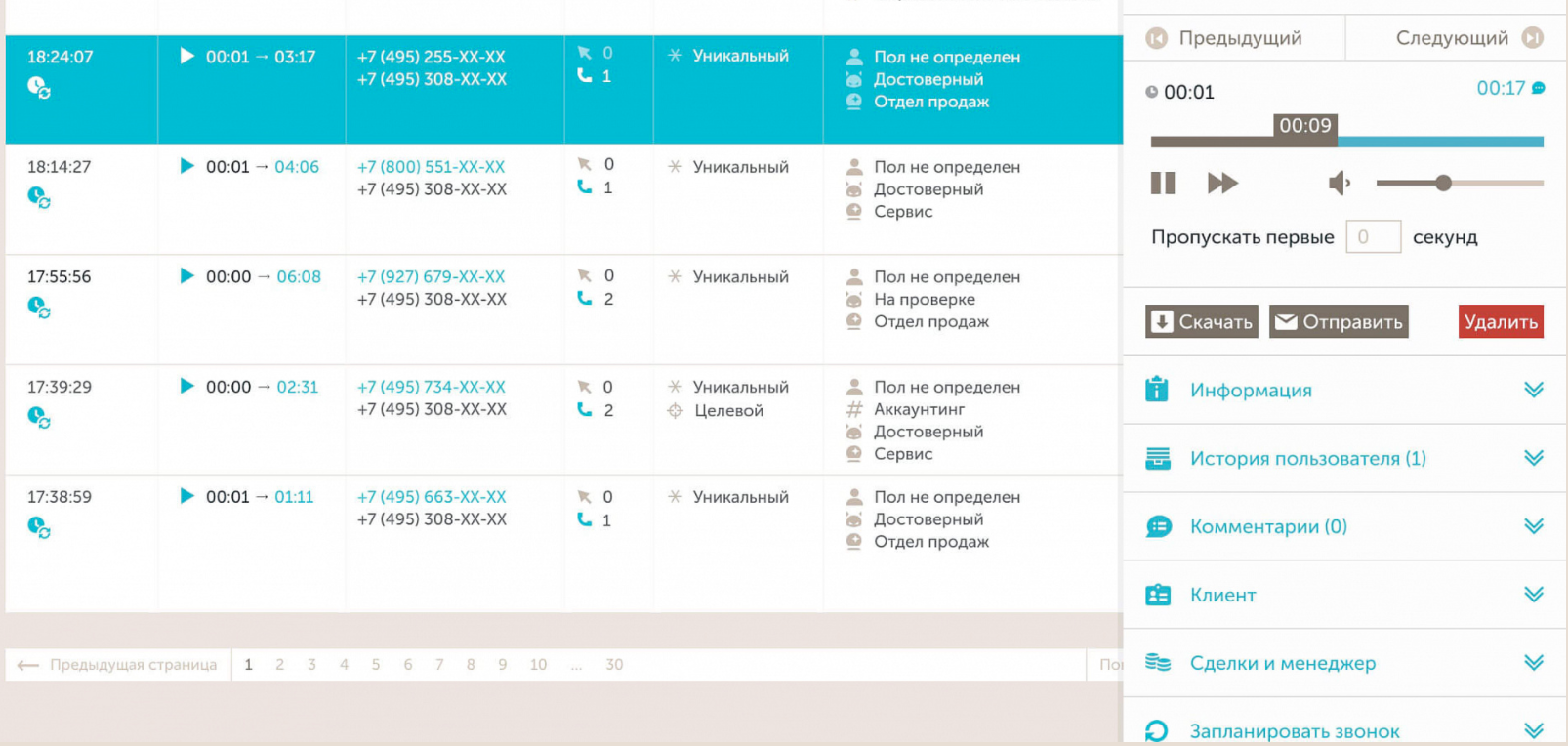 Это скользкая ситуация, которую лучше предотвратить, чем допускать. Если в вашей компании такое уже случалось, задумайтесь о прослушивании звонков. В Calltouch вы можете воспользоваться записью звонков и удобным плеером для того, чтобы понять, как работают ваши менеджеры. А также планировать их работу от пиковой нагрузки, чтобы не пропускать звонки и не вынуждать клиента висеть на линии миллион лет.