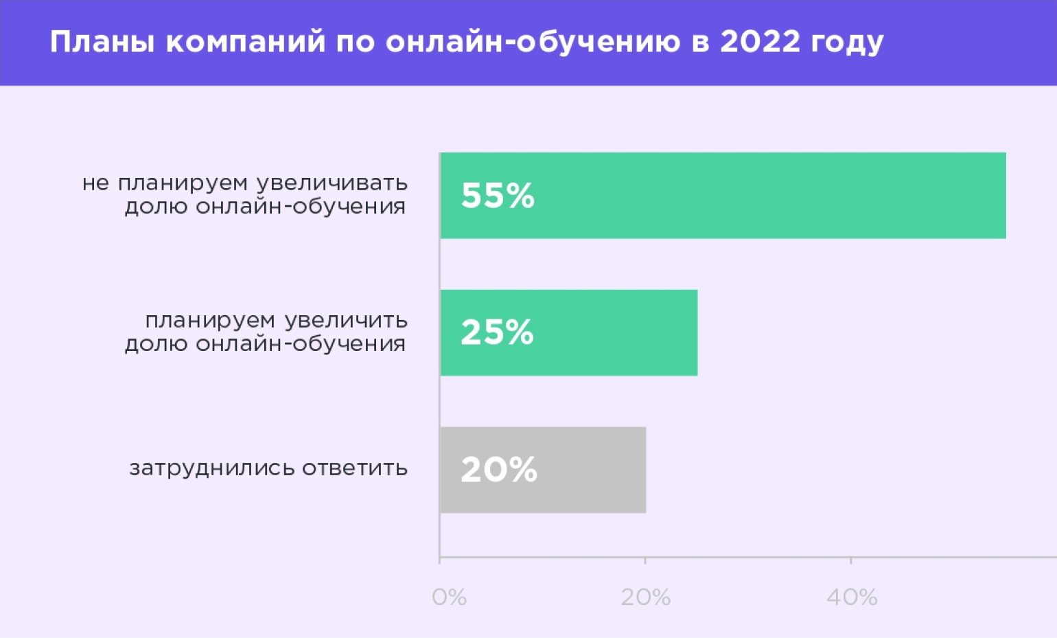 Что касается формы обучения, то здесь очевидны последствия пандемии — 75% корпоративных программ проводятся онлайн и отказываться от этого формата не собираются. На них же уходит и значительная доля бюджета — 66%. Только 25% опрошенных компаний планируют увеличить долю онлайн-обучения, но большинство (55%) собирается сохранить текущее положение вещей.