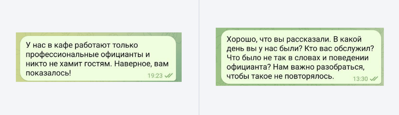 В примере на первом скриншоте предприниматель сразу принял сторону сотрудников — такой подход только больше разозлит клиента. Во втором случае предприниматель разбирается в ситуации — такой ответ показывает, что он доверяет мнению клиента
