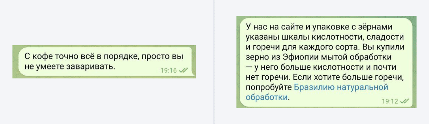 В примере на первом скриншоте человеку никак не помогли. Во втором случае предприниматель рассказал о кофе и предложил выбрать другое зерно — так клиент сможет глубже погрузиться в кофейную культуру