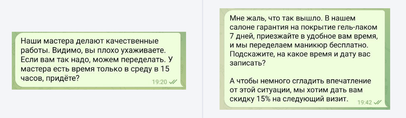 В первом случае клиентке предлагают исправить неудачный маникюр, но так, что она не захочет вернуться. Во втором о гостье позаботились: не обвинили и предложили любое время для визита