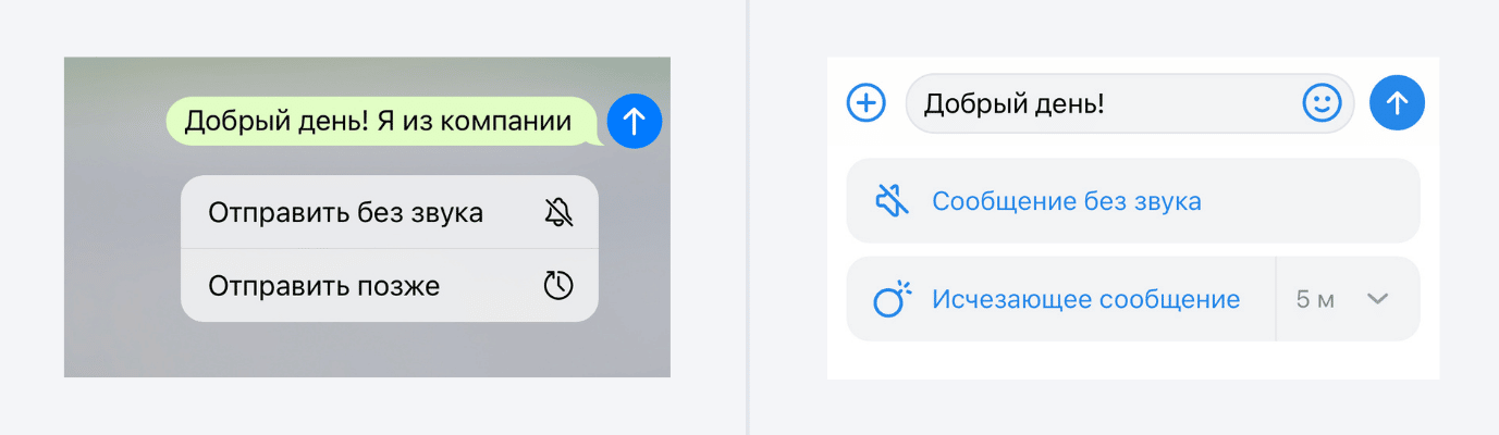 Чтобы отправить в Телеграме или ВКонтакте отложенное или беззвучное сообщение, напишите текст и зажмите синюю кнопку со стрелкой. Функция есть только в мобильных версиях