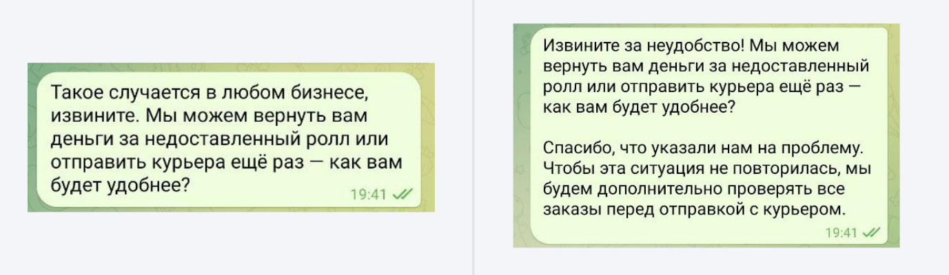 В обоих случаях предприниматель предлагает варианты, как исправить ситуацию. Но во втором делает это заботливее. Клиент видит, что его обратная связь важна