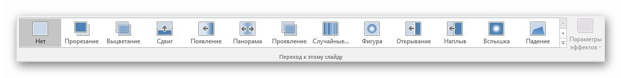 Этот пункт наполовину относится к дизайну и внешнему виду презентации. Он не имеет такого первостепенного значения, как настройка внешнего, так что его необязательно делать вовсе. Находится данный инструментарий во вкладке «Переходы».