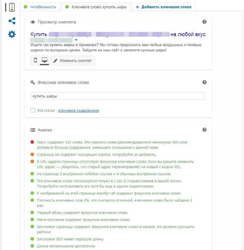 - читабельности – SEO-плагин анализирует количество слов и структуру абзацев;