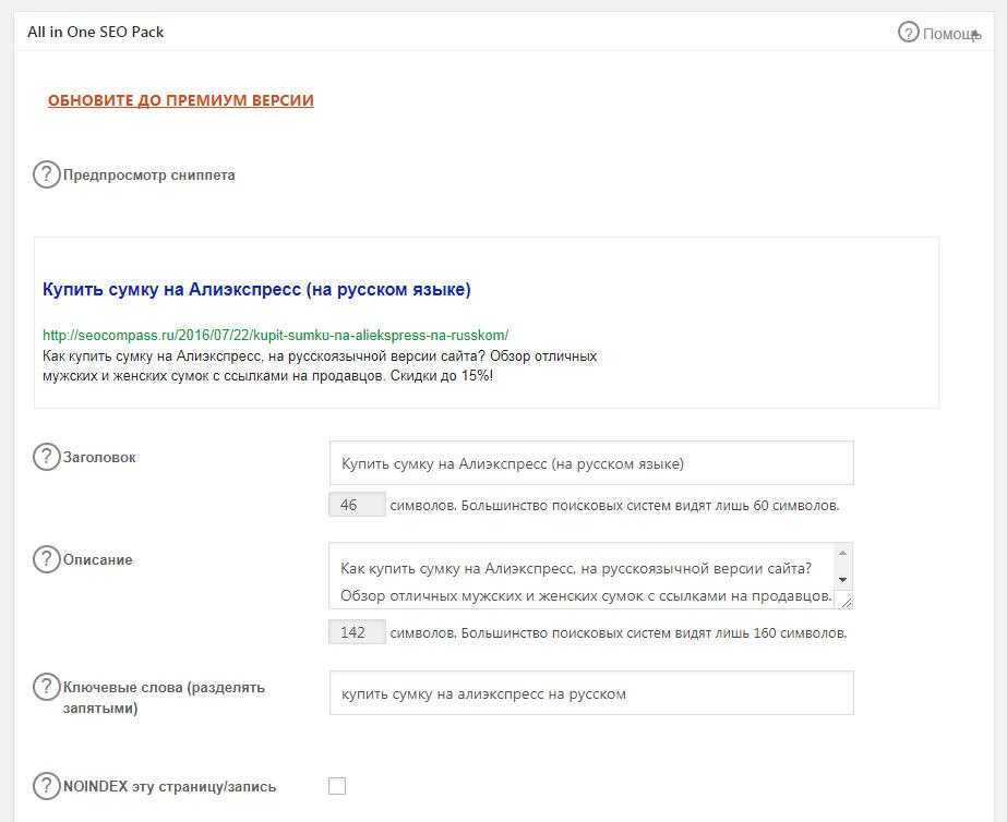 Дополнительный комфорт при применении All in One SEO Pack обеспечивается тем, что плагин автоматически отправляет в Google и Bing сведения об обновлении на сайте и самостоятельно генерирует метатеги.