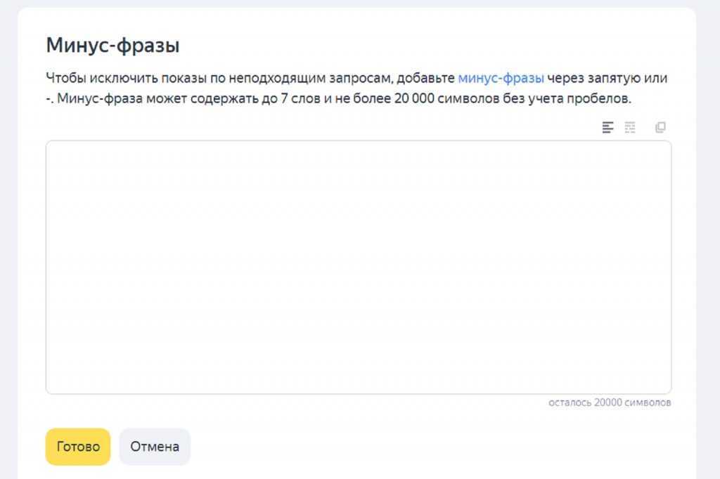 В конце прописываем контакты, время показа, конкретные часы, если это важно, вплоть до праздничных дней, а также минус-фразы – они помогают исключить демонстрацию рекламы по неподходящим запросам. Слова добавляют через запятую в специальном поле