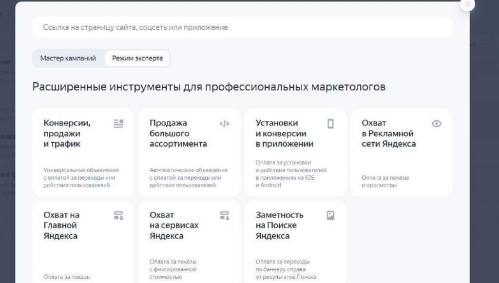 У РЭ расширенные возможности. Если мы хотим получить больше трафика, продаж и конверсии, выбираем первый пункт и определяемся с видом РК. Допустим, нам нужны «Текстово-графические объявления». После система предложит указать место показа.