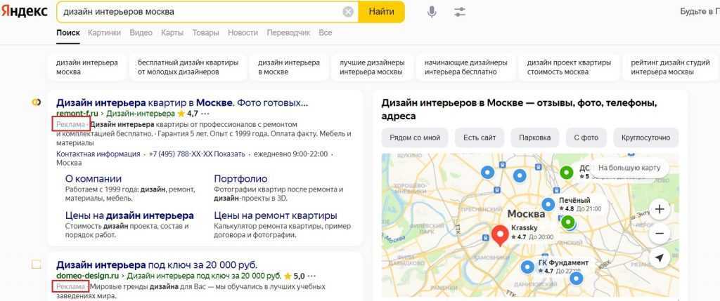 Поисковая реклама Яндекс Директ по запросам. Ее транслируют в качестве ответа на искомые фразы – ключи. Владельцу студии декора нужно лишь указать словосочетание «дизайн интерьеров Москва» при создании объявления, чтобы оно выводилось людям, которые запрашивали это в поиске.