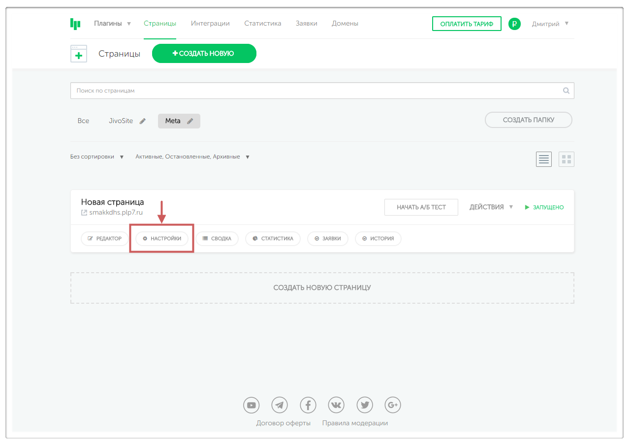 Шаг 4. Переходим в личный кабинет Платформы LP, заходим в «Настройки страницы»
