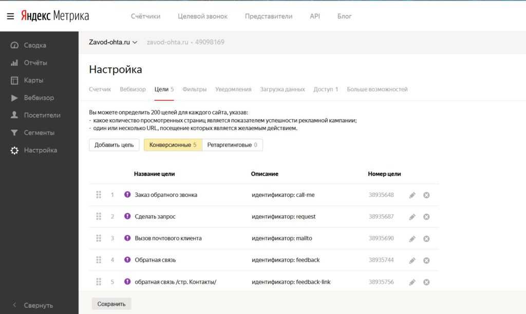 На картинке выше вы можете видеть конверсионные цели, созданные для форм заказа и обратной связи. Благодаря этим целям я могу легко сделать выборку по пользователям, которые совершили данное действие и просмотреть параметры их визита в вебвизоре.
