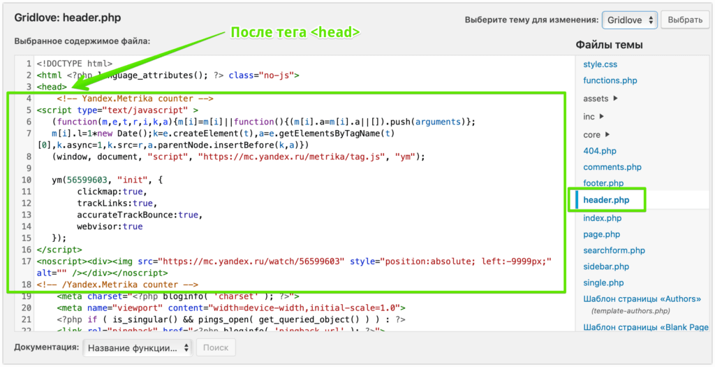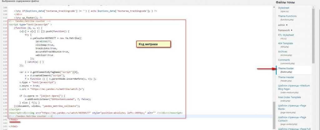 Справа вы увидите список всех файлов установленной темы. Нам нужен header.php. Открываем его и ищем тег </head>. Прямо перед ним и добавляем код метрики. Обновляем.