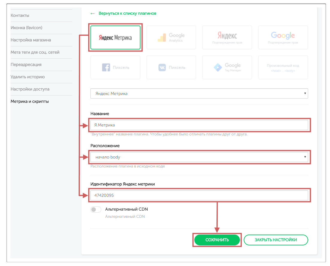 Шаг 5. При добавлении нового плагина укажем:Название – внутреннее название плагина, показывается только в настройках страницы.Расположение – можно задать место для вставки кода метрики на странице (Яндекс советует разместить код ближе к началу страницы: так он будет быстрее загружаться).Идентификатор Яндекс.Метрики – в это поле необходимо вставить скопированный номер счетчика Яндекс.Метрики, например: 47420095.