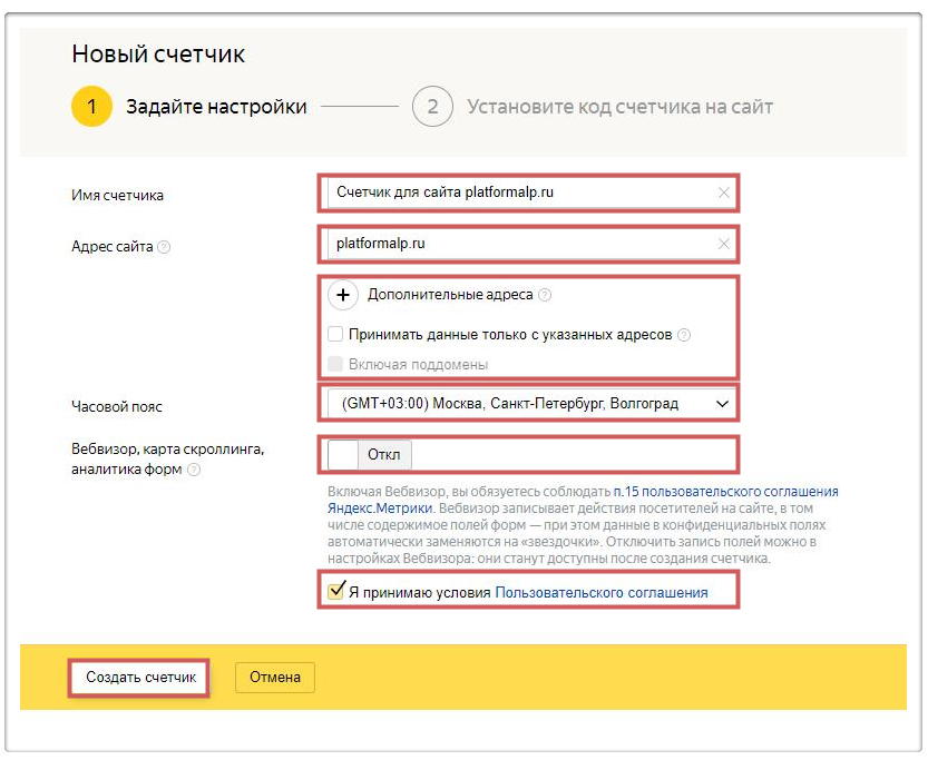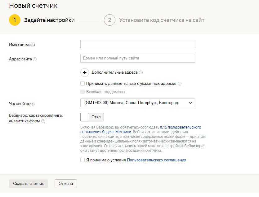 Примите условия пользовательского соглашения — и переходите на следующий важный этап, на котором вам нужно будет установить счётчик на ваш сайт.