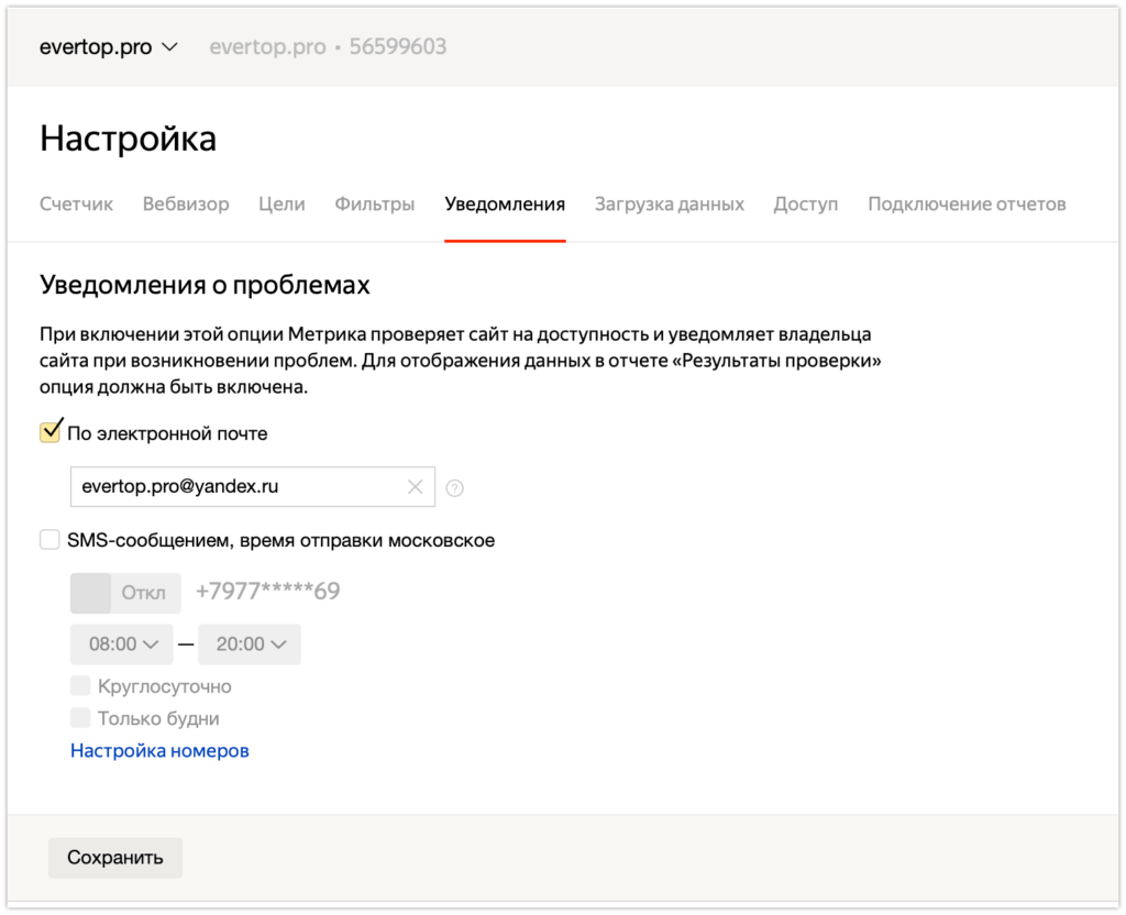 - желательно ввести отправку уведомлений на Email и мобильный телефон (в виде SMS). Например, если вы уехали куда-нибудь отдыхать и в этот момент что-то приключилось с хостингом и сайт недоступен или очень медленно грузится, то Яндекс Метрика сообщит вам об этом по телефону.