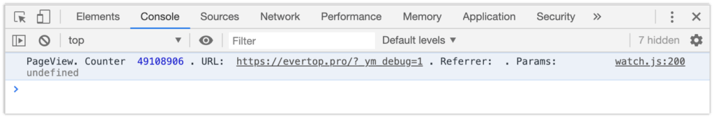 После перехода необходимо вызвать консоль, для этого нажмите сочетание клавиш сочетания клавиш Ctrl + Shift + J если у вас Windows или ⌥ + ⌘ + J если у вас операционная система от Apple. Если код метрики установлен правильно, то в консоли вы увидите номер вашего счетчика и параметры, которые отправляет код.