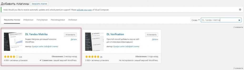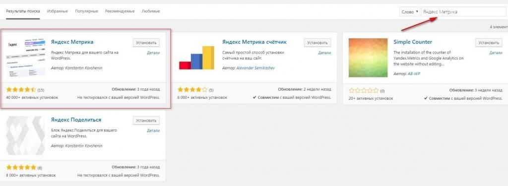 Перейдите в раздел «Плагины». В строке поиска (справа) введите «Яндекс Метрика». Вы увидите плагин от Konstantin Kovshenin. Он отлично подходит для начинающих.