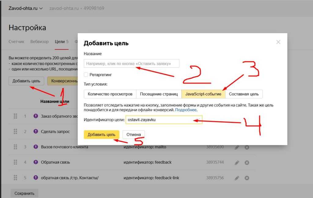 Если у вас нет аккаунта на Яндекс.Метрике или сервис еще не подключен – зарегистрируемся и подключаем номер счетчика.Шаг 2. Настраиваем и добавляем цель (более подробнее о целях и их типах)Нажимаем на «Добавить цель», выбираем вкладку «JavaScript-событие»