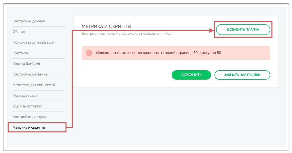 во вкладку «Метрика и скрипты» и нажимаем «Добавить плагин»