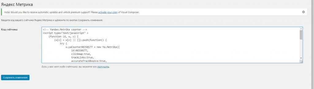 Активируйте плагин и перейдите во вкладку «Настройки» — «Яндекс.Метрика». В полученном окне вставьте счетчик.