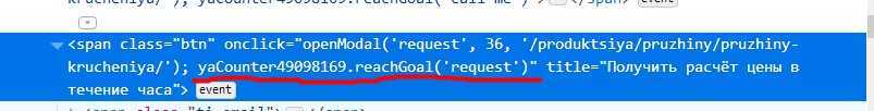 Вводим адекватное название, чтобы потом разобраться, что данная цель собой представляет. Например, для кнопки отправить заявку наберем «Отправка заявки на расчет пружины». Выбираем Java-Script событие, т.к. данная цель будет отслеживать отправку из формы отправки заявки. Латинскими буквами вводим идентификатор цели. Рекомендую давать адекватные названия, чтобы потом не ломать голову, к чему этот идентификатор относится. И жмем кнопку «Добавить цель». Всё просто. Но это не конец. Теперь необходимо на сайте добавить отслеживание события по цели. Для этого необходимо внести правки в код кнопки. Смотрите картинку ниже!