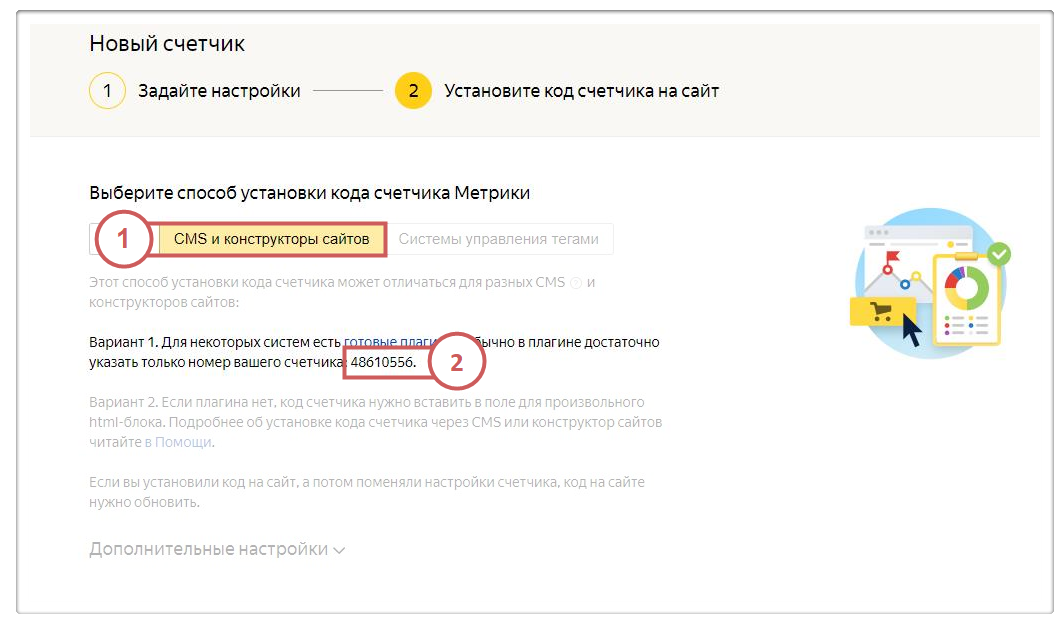 Шаг 3. После создания счетчика откроется «Выбор способа установки счетчика».Выбираем способ установки: «CMS и конструкторы сайтов» и копируем номер счетчика из «Вариант 1».