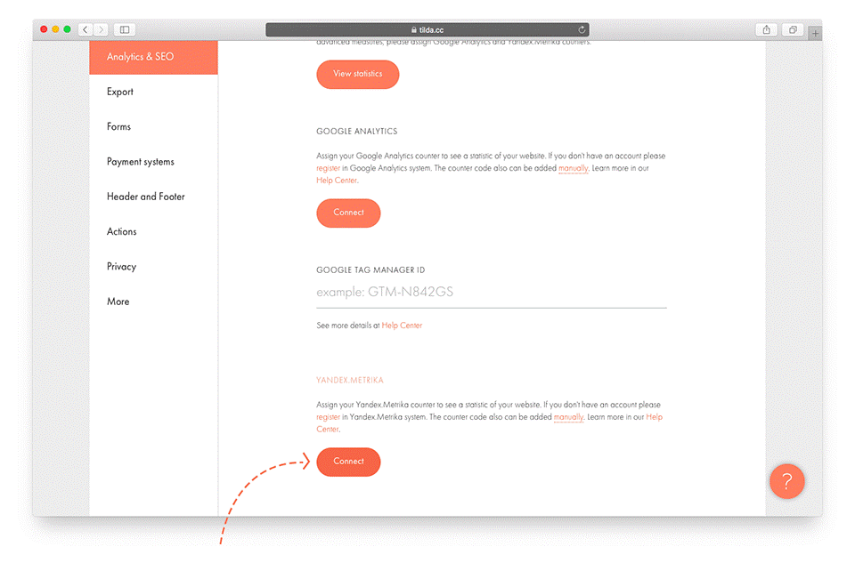 Чтобы вставить счетчик на Тильду, зайдите в «Настройки сайта» — «Веб-аналитика».