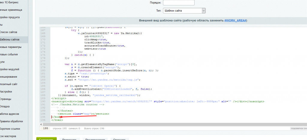 - ну и расположение кода Яндекс Метрики в одну строку (для компактности).