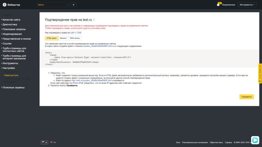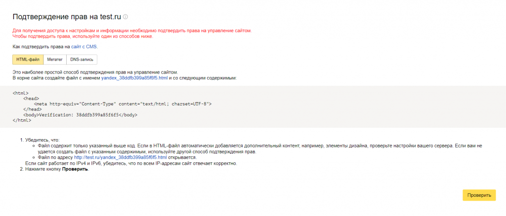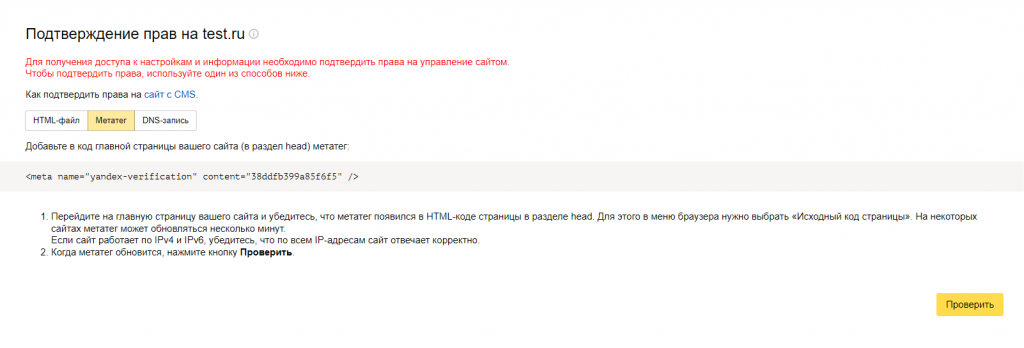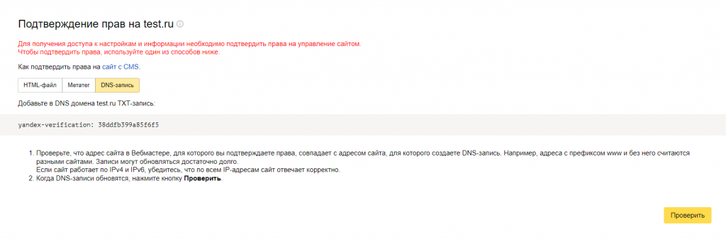 Он является самым легким и не требует специализированных знаний. Также стоит учесть, что подтверждение при помощи DNS-записей может занять до 48 часов. Это связано со временем, которое занимает процесс обновления, а еще механикой самой поисковой системы.