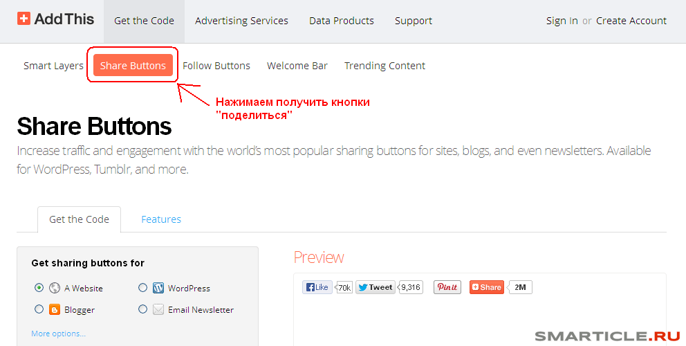 Перейдя на , вы сразу же попадает в генератор, в котором по шага расписан процесс формирования блока социальных кнопок и добавление его на интернет ресурс.