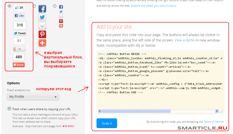 Мне понравился вертикальный вариант расположения кнопок, вы можете выбрать абсолютно любой. После этого копируем код в правом окне, либо обычным способом ctrl+с, или клацаем клавишу Grab It, что тоже самое.