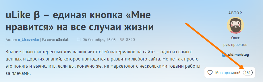 Кнопки uLike дают возможность узнать, какие из материалов на сайте являются самыми интересными для читателей. Главное отличие кнопки в том, что она работает независимо от социальных сетей, т.е. учитывает голоса всех посетителей сайта. При этом количество голосов пользователей отображается рядом с кнопкой: