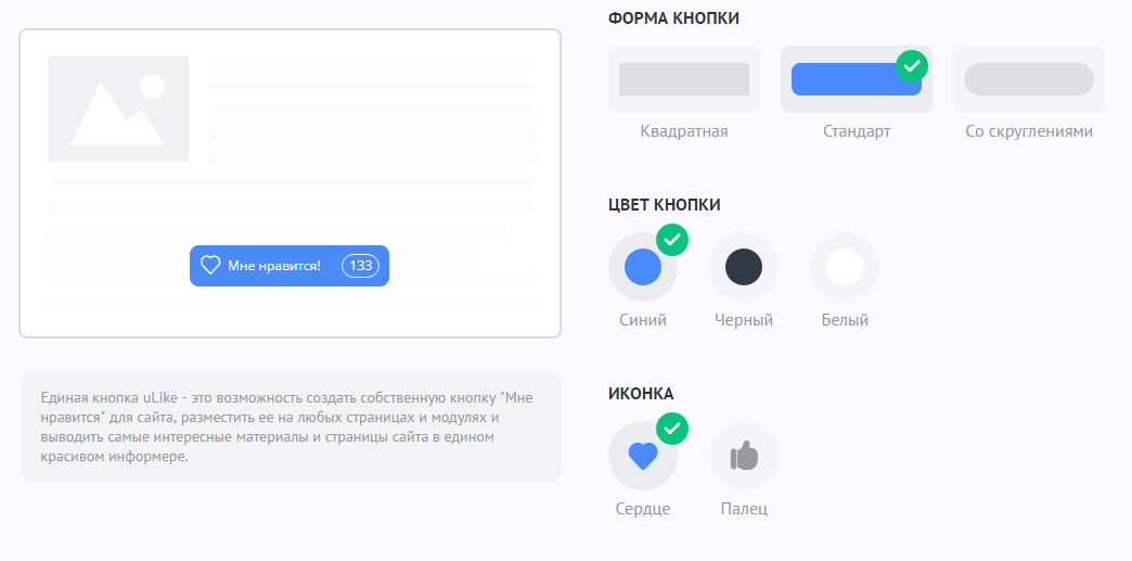 Как и другие кнопки, uLike имеет ряд настроек, которые позволяют вписать их в дизайн любого сайта. Так, можно выбрать форму, цвет и иконку для кнопки: