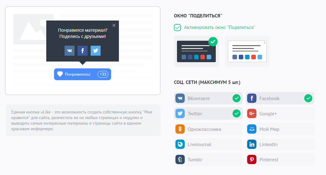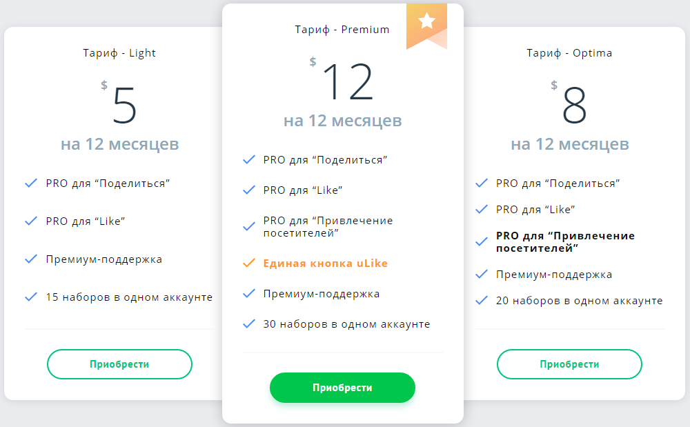 Весь функционал uSocial доступен бесплатно и это не может не радовать, за исключением кнопки uLike. Данная кнопка доступна только в тарифе Premium. В целом же платные тарифы расширяют и без того широкие возможности инструментов: