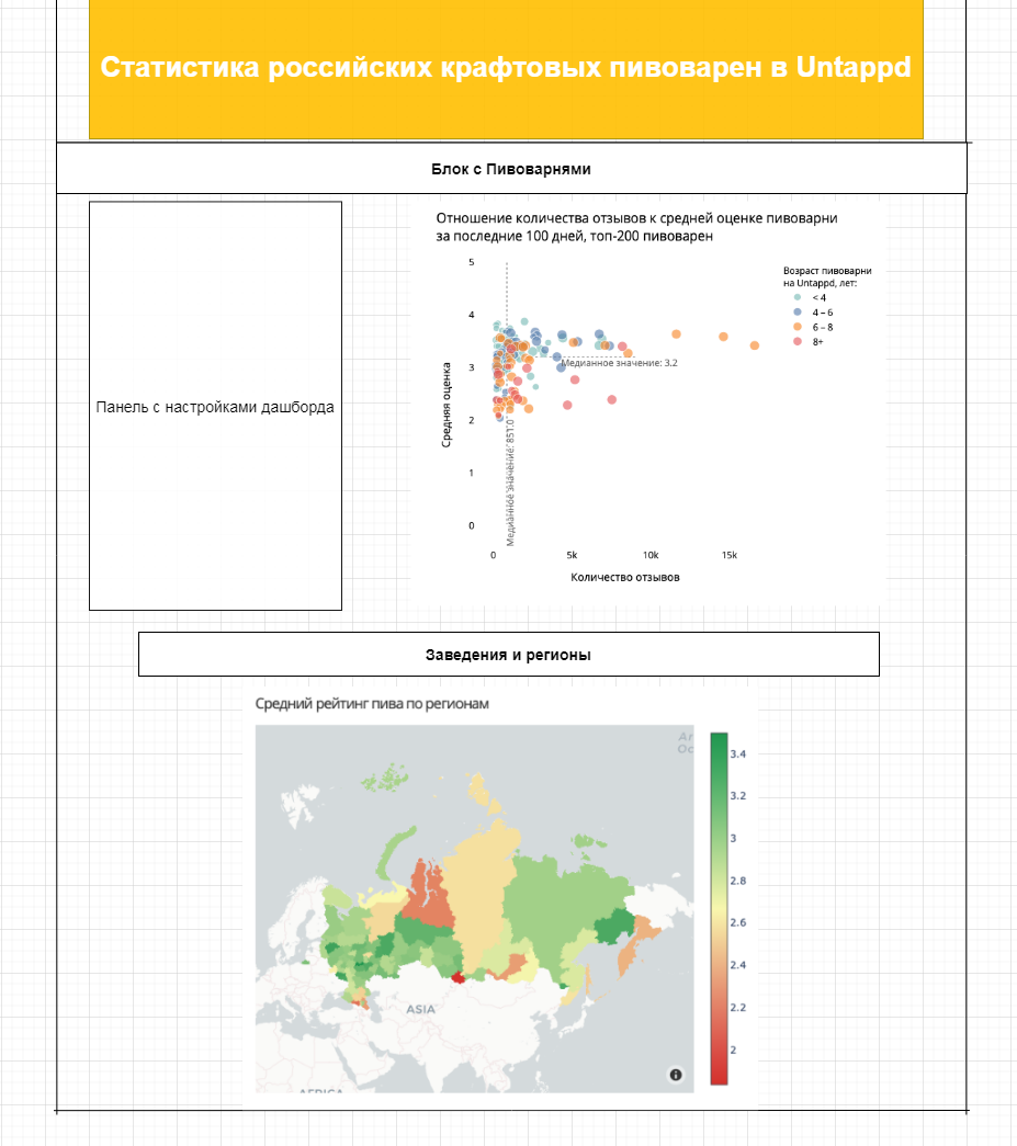 Как и сам дашборд, шапка будет оформлена в главных цветах Untappd — белом и золотом. Ниже расположится раздел с пивоварнями, состоящий из scatter plot и панели с настройками. А в самом низу будет карта, показывающая средний рейтинг напитка по регионам России.