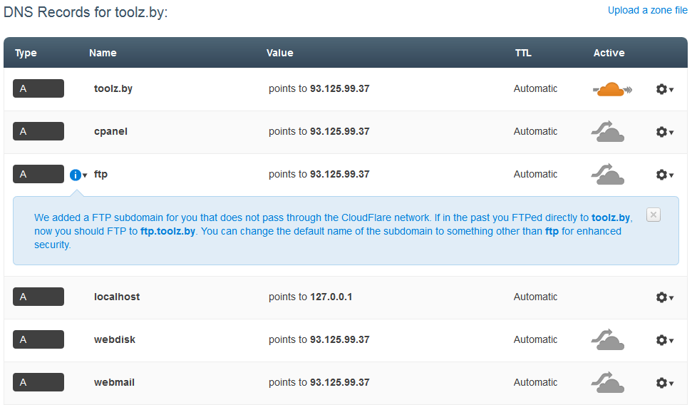 Чтобы начать пользоваться CloudFlare, нужно зарегистрироваться и добавить свой сайт/сайты. После добавления каждый сайт сканируется (это занимает около минуты), а после сканирования вам показываются все найденные данные DNS, которые вы можете поменять. Но если не знаете точно, что и как, лучше ничего не трогайте, как я