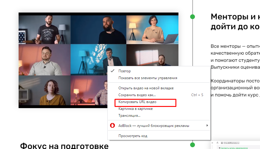 Чтобы узнать URL отдельного файла (например картинки), достаточно навести курсор на изображение, нажать правую клавишу мыши и выбрать пункт «Копировать адрес изображения». Если затем вставить его в поисковую строку, можно открыть только эту картинку, без перехода на сам сайт. Такой же прием работает и с другими отдельными файлами. Пример показан на картинке: страница сайта skillfactory.ru и попытка скопировать URL видео.