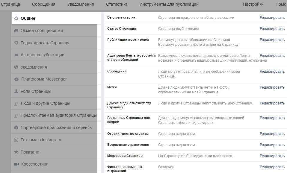 Открыв страницу вашего сообщества, в правом верхнем углу вы увидите ссылку на ваши Настройки. Вам сразу откроется список функций, с помощью которых можно настроить вашу страницу в Facebook. И первыми мы видим общие настройки – к ним и перейдем.