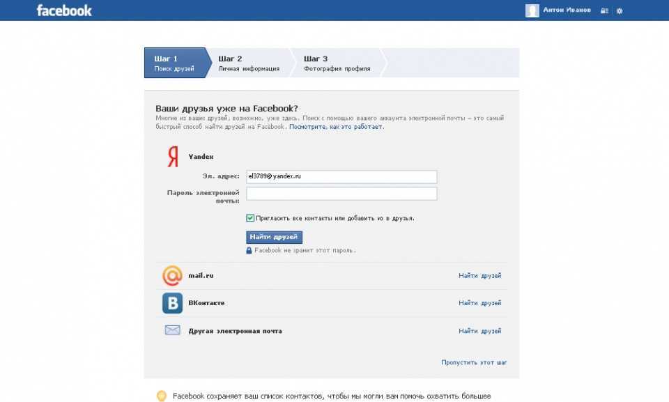 Шаг первый. Введите пароль своего электронного «ящика». После чего, Facebook предложит добавить в друзья Ваши контакты из электронного ящика. Также возможно пропустить данный шаг, и вернуться к нему позже (уже зарегистрировавшись).