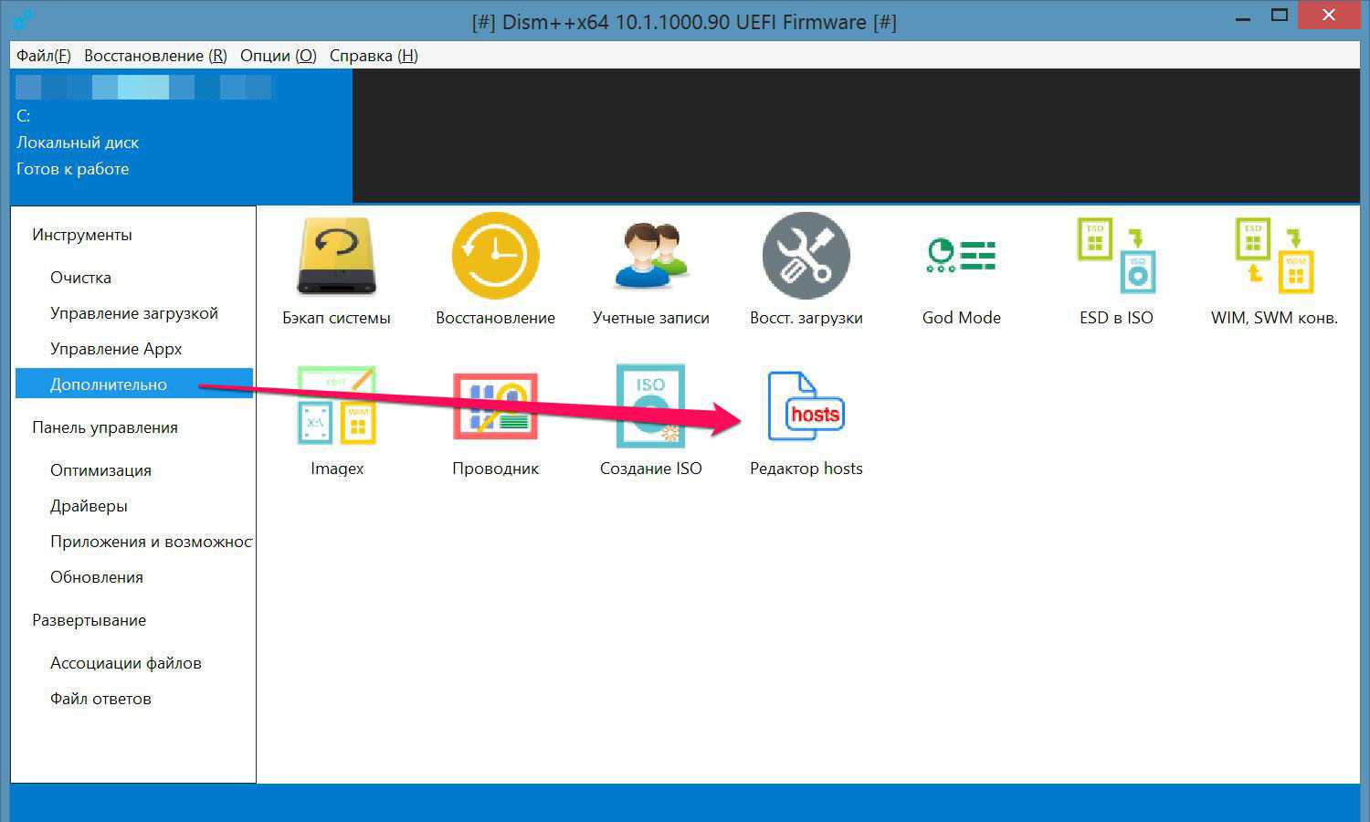 Продвинутый интерфейс с низкоуровневым доступом к системе, с его помощью вы сможете без труда не только подправить hosts, но и выполнять ряд других, полезных операций, вроде очистки диска от мусора, создания резервной копии диска и т. п. Данная утилита распространяется совершенно бесплатно, её исходный код открыт, и она активно разрабатывается энтузиастами со всего мира.