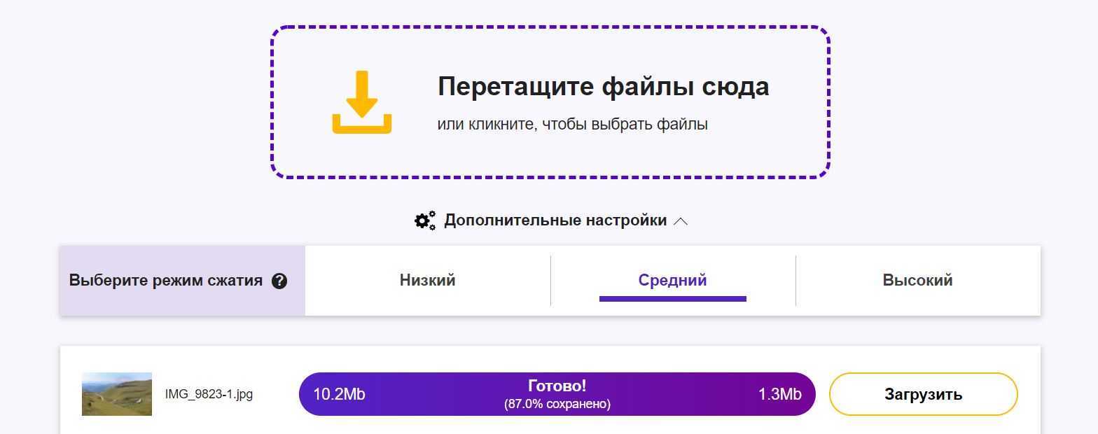 Приятный сайт для сжатия фотографий, очень простой, на русском языке. Есть три режима сжатия: низкий, средний, высокий. Я попробовала средний вариант и websiteplanet сделал из 10 Мб фотографию в 1,3. Очень достойно, и качество хорошее, и бесплатно. Пожалуй, мой фаворит номер два по сжатию файла онлайн.